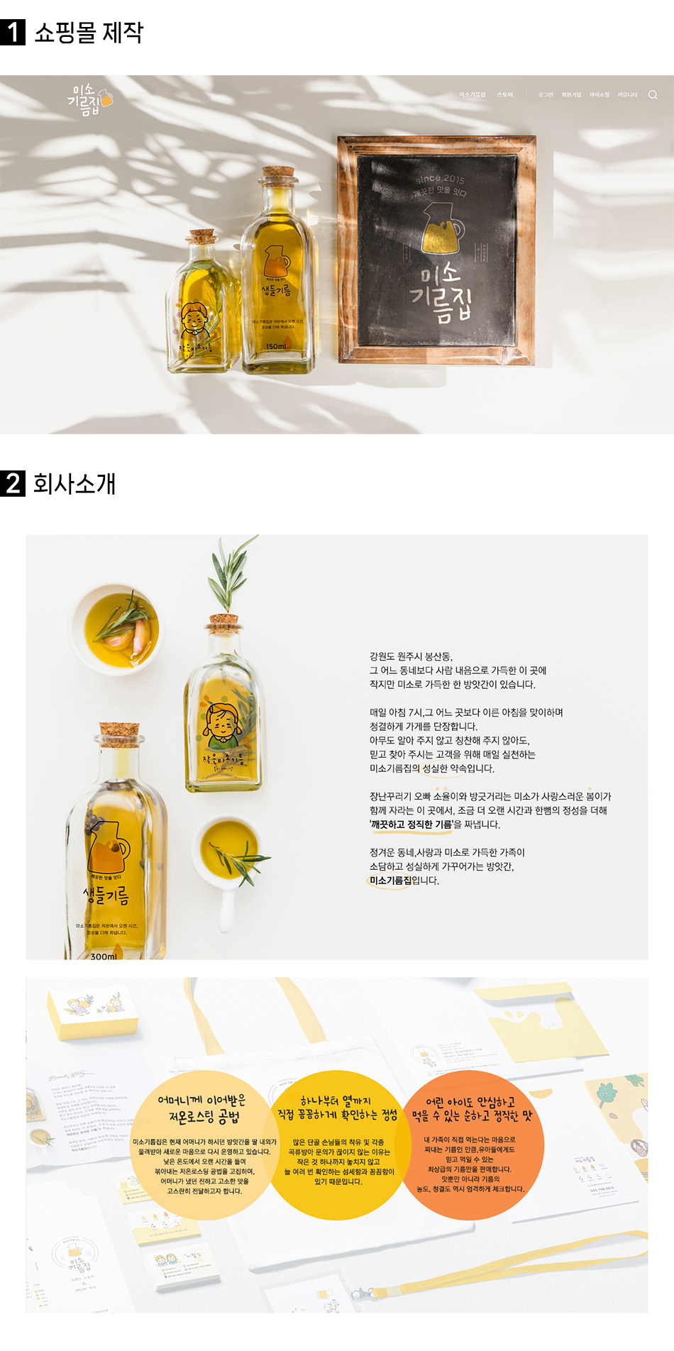 브랜드 ‘미소기름집’ 소개 페이지와 상품 상세 페이지 전반을 작업했으며,