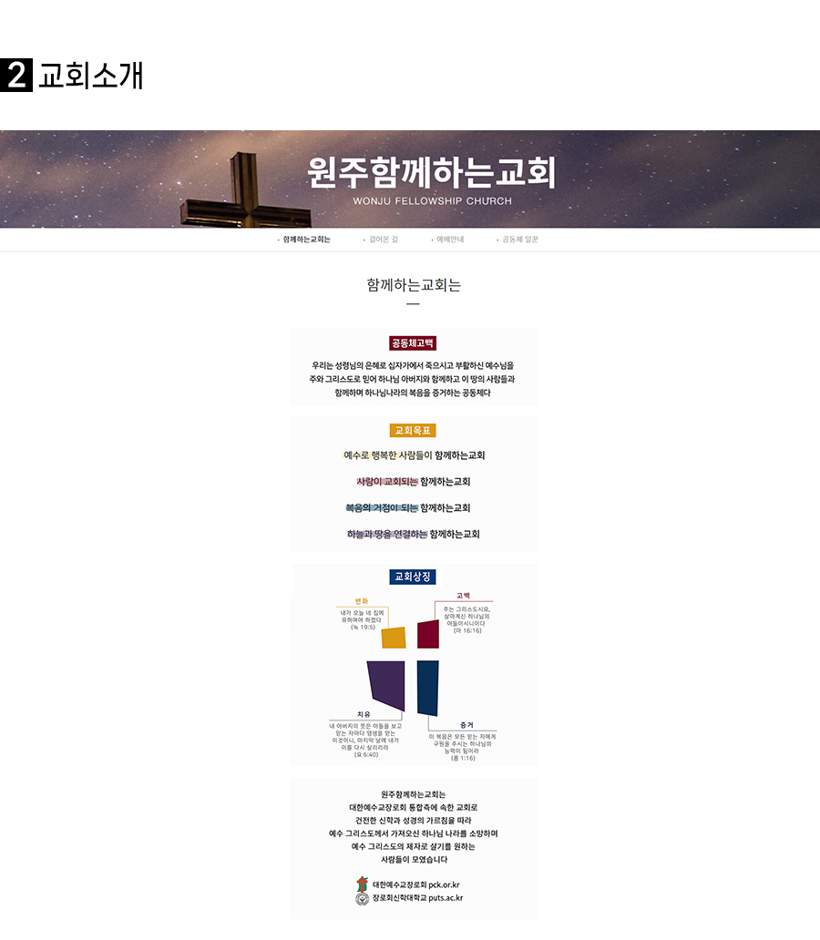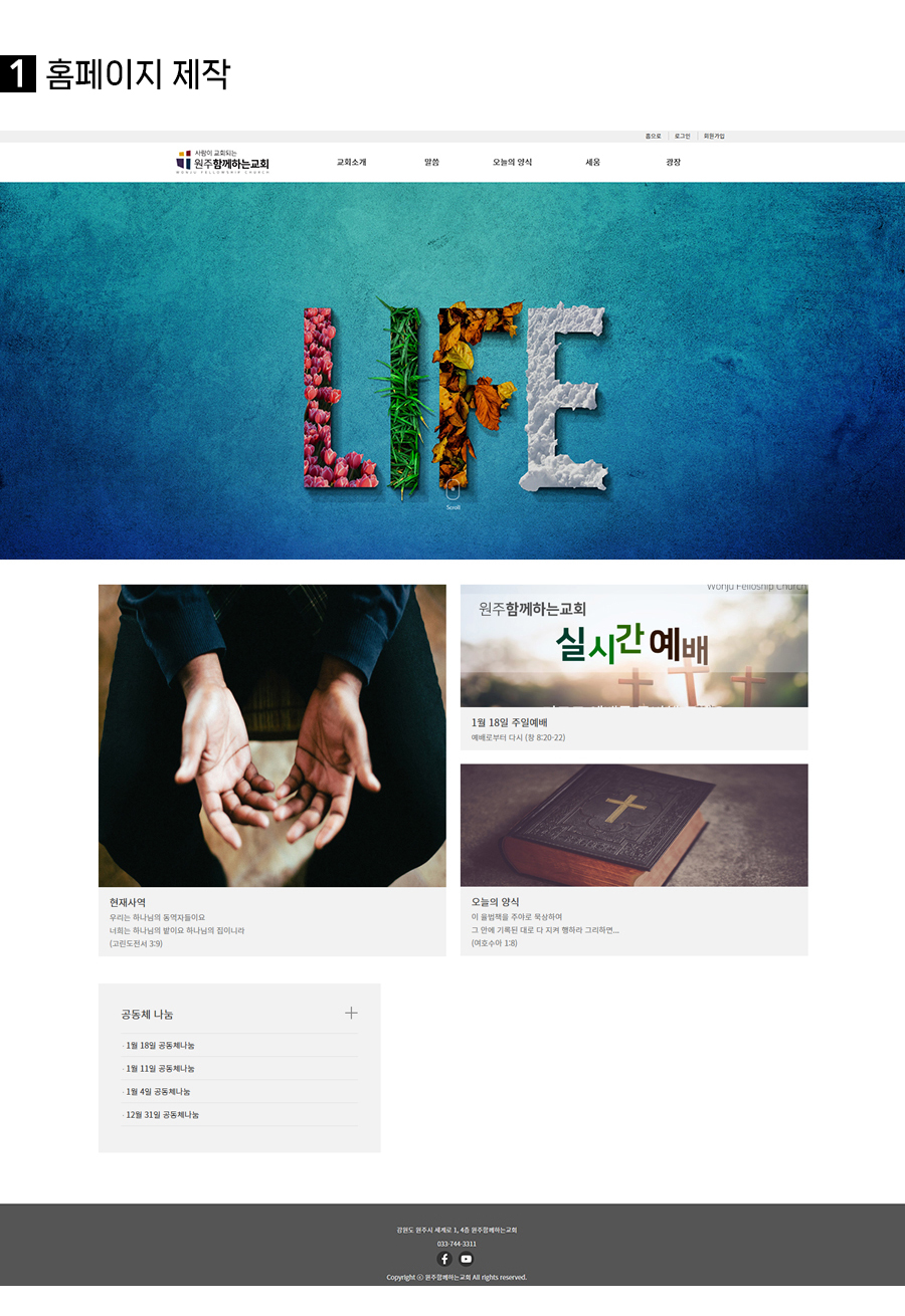 함께하는 교회ok1ha2026-01-22T13:50:42+09:00 함께하는 교회About This Project사용된 프로그램 : 카페24, 포토샵 2020년 프리랜서 디자이너로서 처음 맡아 진행한 교회 홈페이지 제작 프로젝트입니다. 교회 소개와 예배 안내 등 주요 정보를 누구나 쉽게 확인할 수 있도록 구조를 설계했으며, 차분하고 단정한 디자인을 통해 교회의 따뜻한 분위기와 신뢰감을 전달하고자 했습니다.CATEGORY:홈페이지 제작